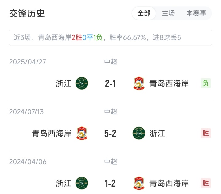 截至赛前,青岛西海岸6胜9平7负积27分,排名中超积分榜第10;浙江队9胜7平7负积34分,排名中超积分榜第6。两队首回合交锋,浙江队主场2-1战胜青岛西海岸。