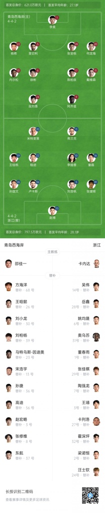 青岛西海岸首发:1-李昊、5-里切利(F)、6-徐彬、22-杨希、28-张呈栋、17-陈柏良、20-何龙海、24-段刘愚、9-阿齐兹(F)、10-内尔松卢斯(F)、11-戴维森(F)