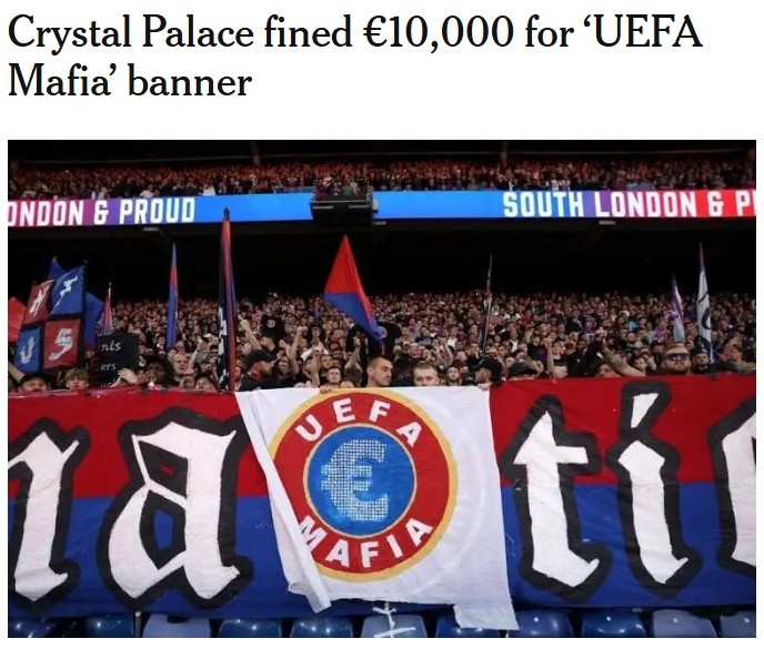 TA:水晶宫球迷展示“欧足联黑手党”横幅,俱乐部被罚款1万欧元